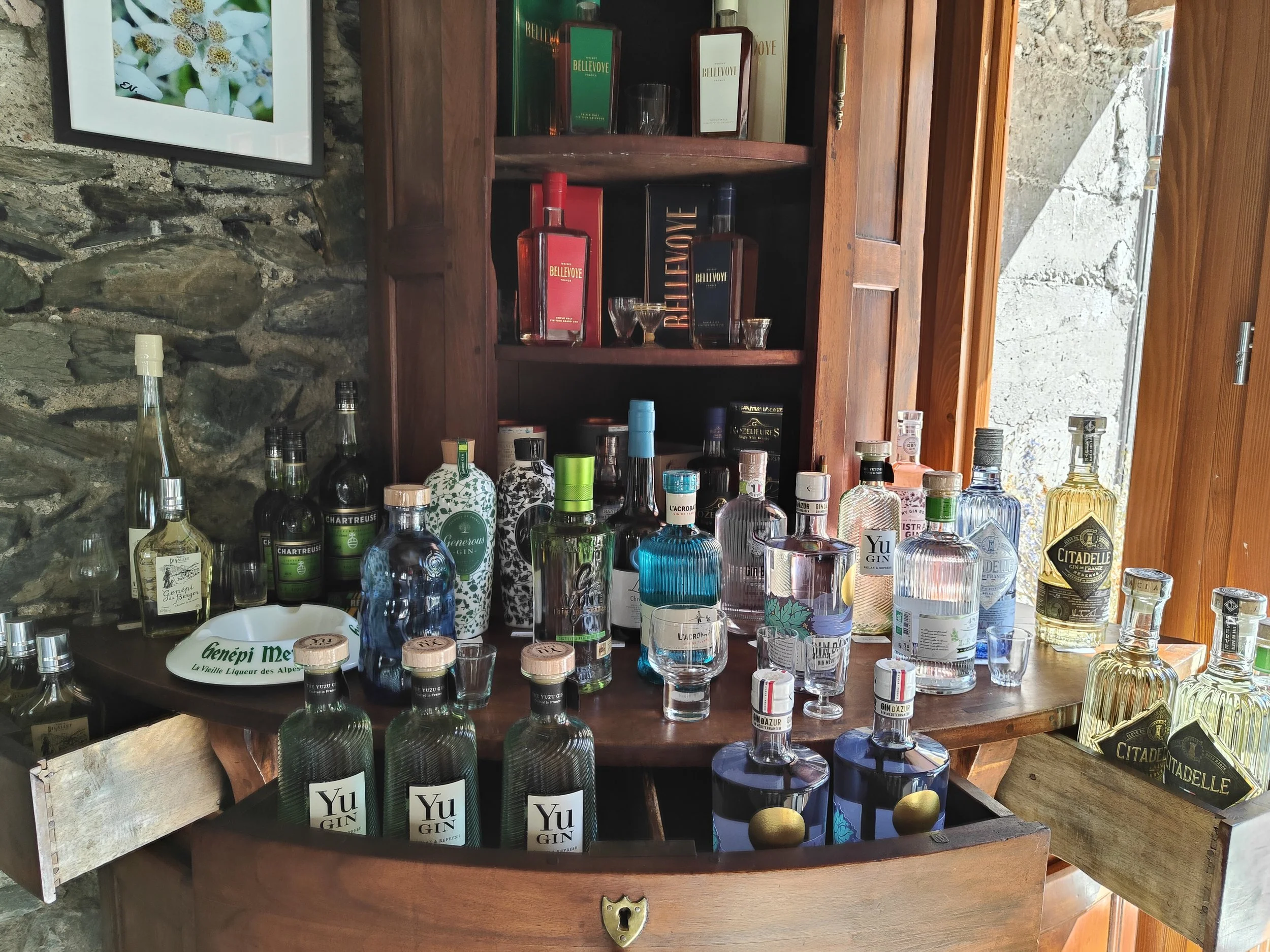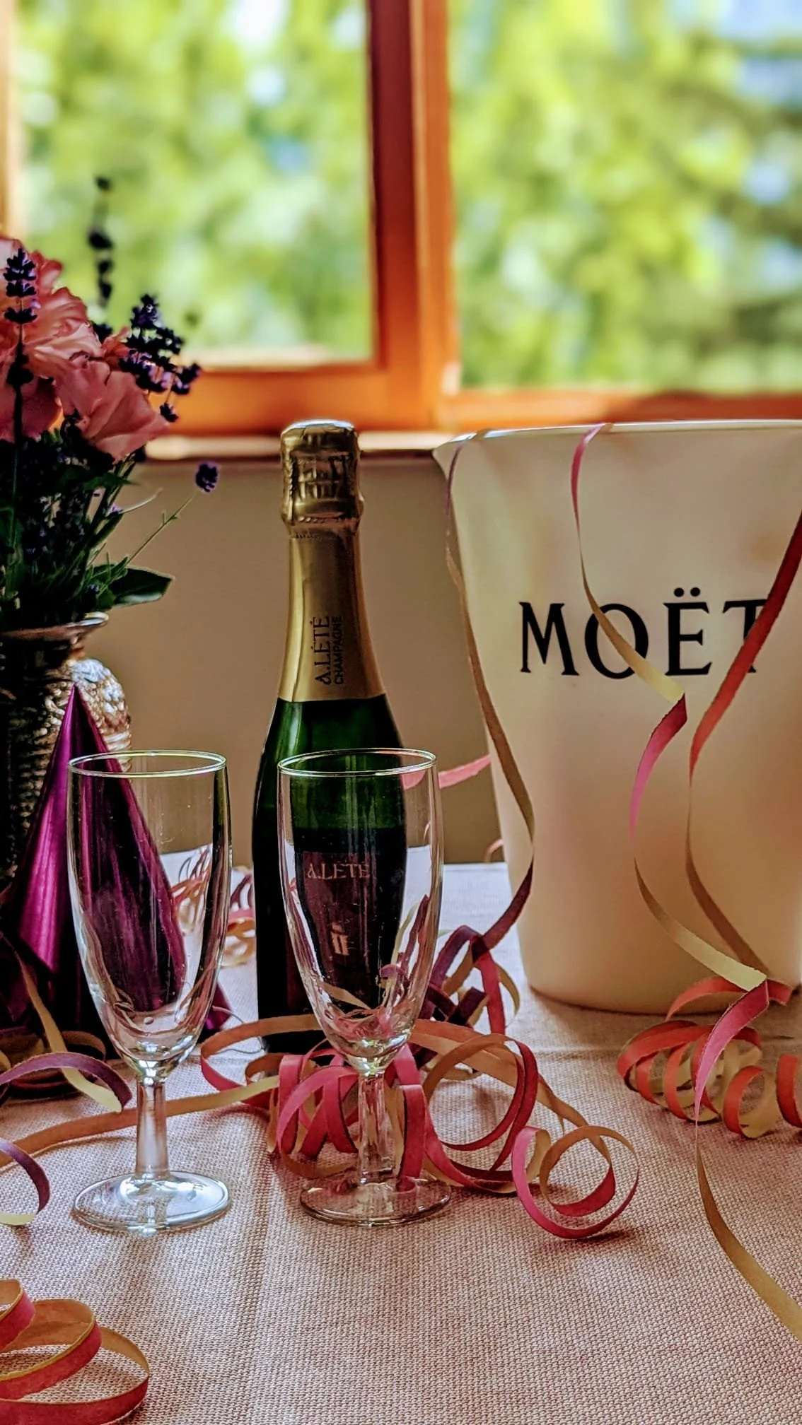 Two bottles of champagne and two wines in the room with two glasses and two portions of local products to share