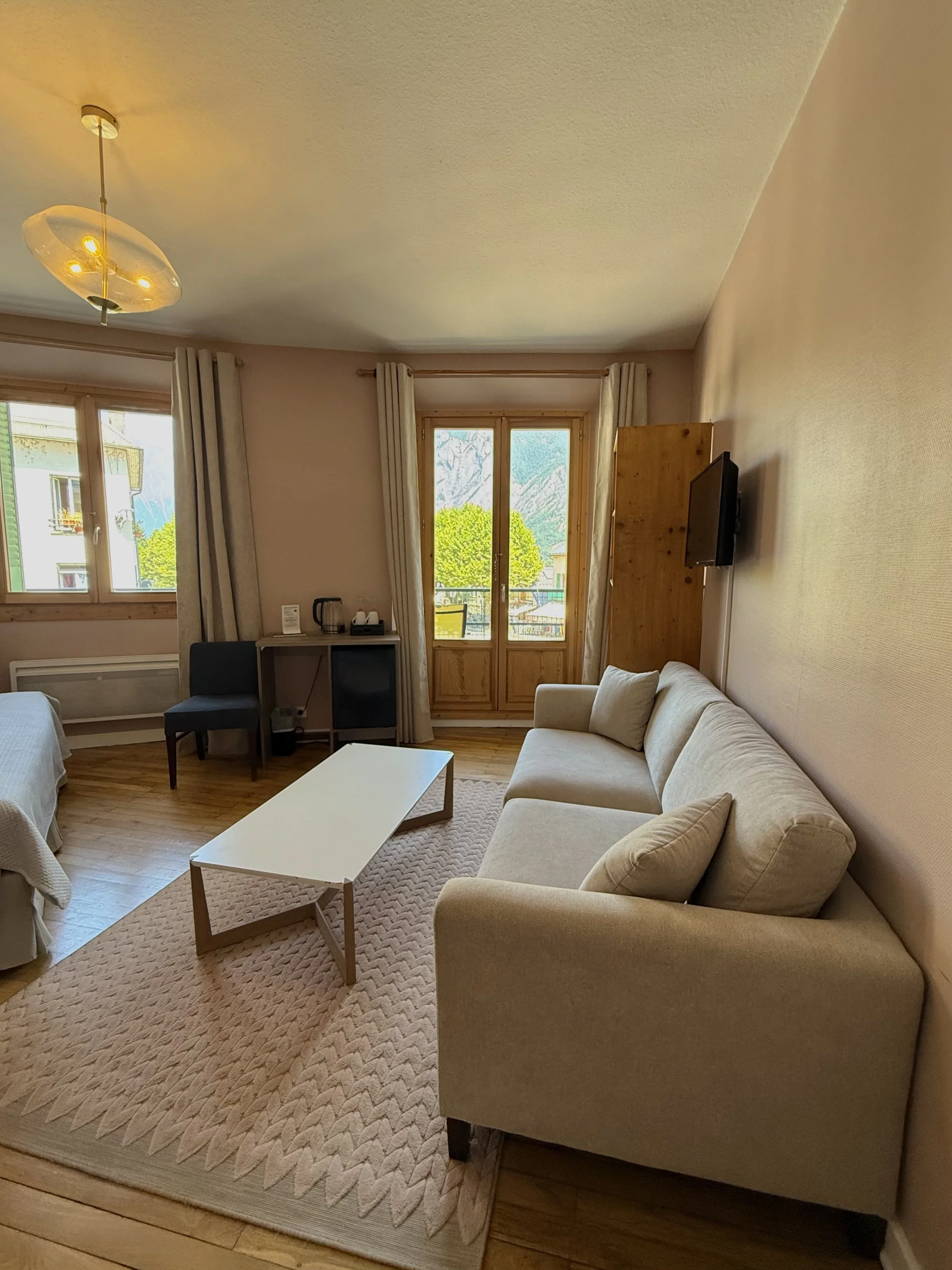 Our Double Standard Room is the ideal choice for couples or friends seeking a peaceful and stylish stay. Thoughtfully designed with a mix of modern touches and natural materials, the room features a comfortable double bed with crisp linens and cozy pillows, a single seater sofa and a couch.